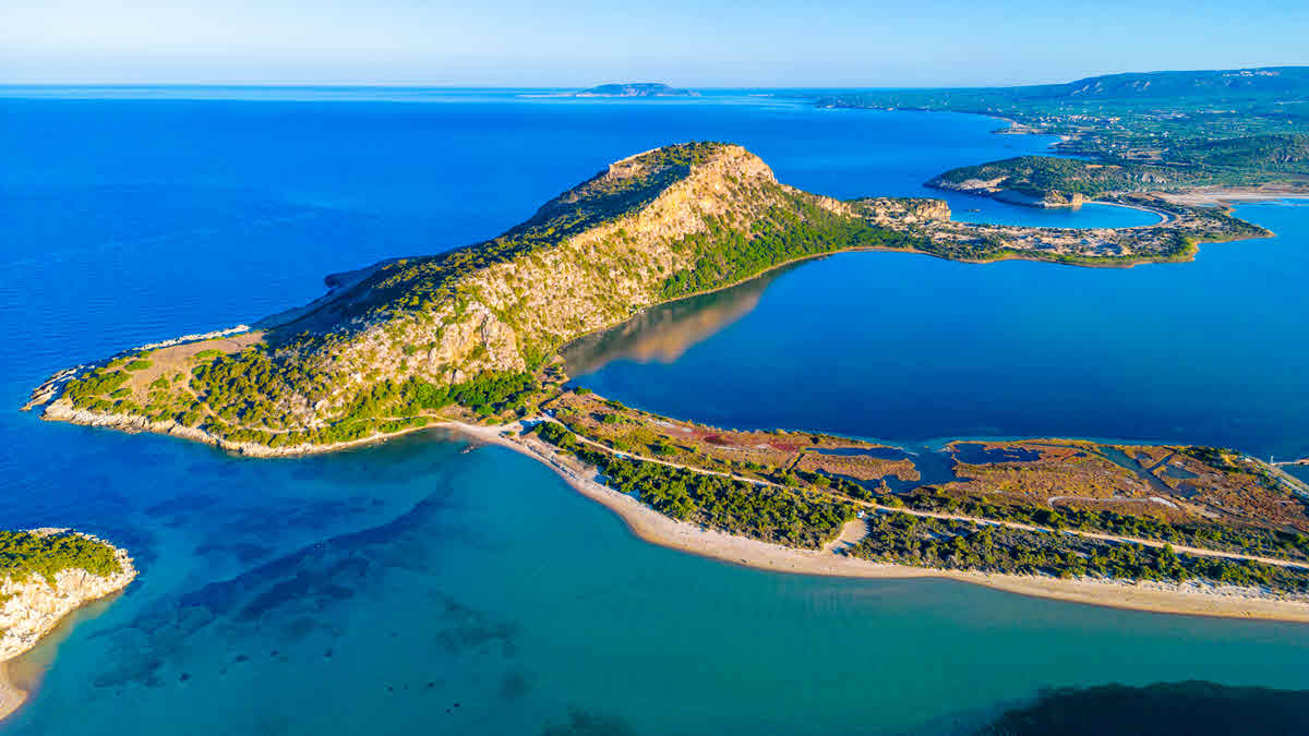 One of the most memorable walks in Greece. The route traces Gialova Lagoon, a Natura 2000 wetland where flamingos gather from autumn through spring, to a perfect omega-shaped beach that Homer described as “sandy Pylos.” A trail then climbs to Nestor’s Cave and a 13th-century Frankish fortress with views across four water bodies. The beach has zero facilities, so bring everything you need.